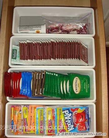 有很多带电线的厨房工具被放在橱柜的深处,有时候我们甚至会忘记他们!现在可以使用塑料箱作为抽屉 !分成不同的类别,贴身标签!
