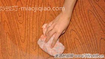 用浸蘸家具蜡清洗:若是药物、饮料或颜料洒在地板上,必须在污迹未深入木质表面前加以清除,先用干抹布擦净,再用浸蘸家具蜡的软布擦拭。