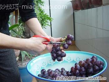 二、用剪刀贴近果蒂处把葡萄一个个地剪下来,可以留一点果蒂,以免伤了果皮;不要用手去揪葡萄,揪下葡萄就可能伤到了果皮;凡是伤了果皮的葡萄放到一边去,留着吃,不用它做葡萄酒。